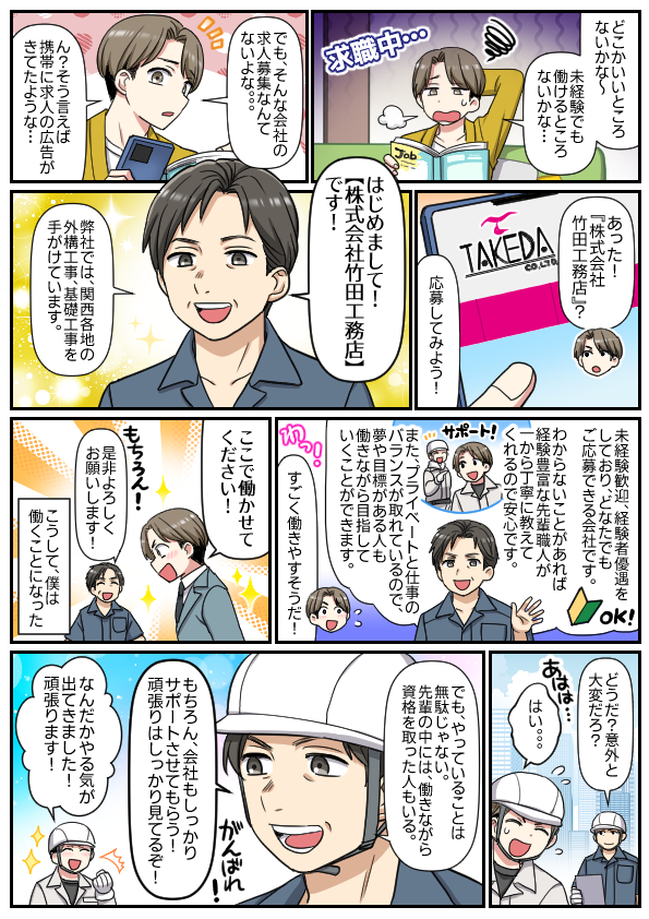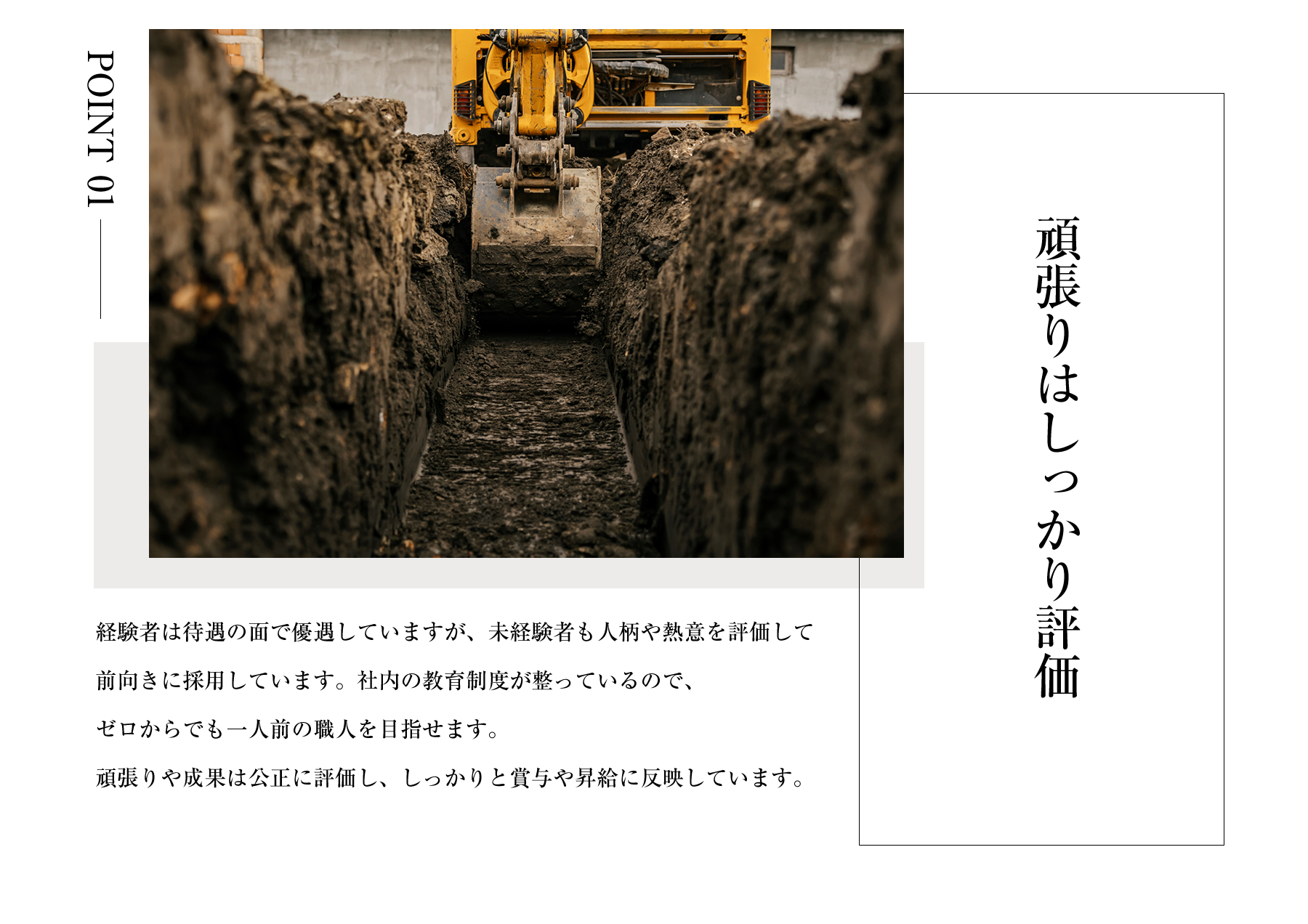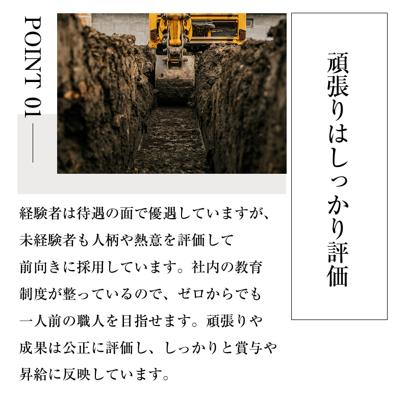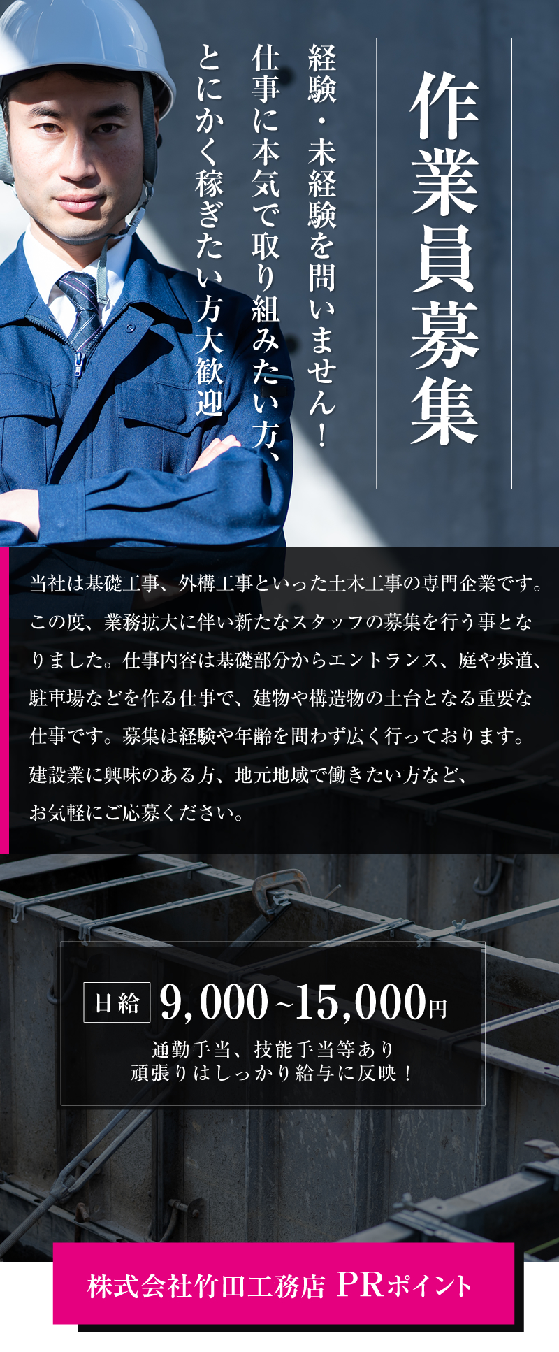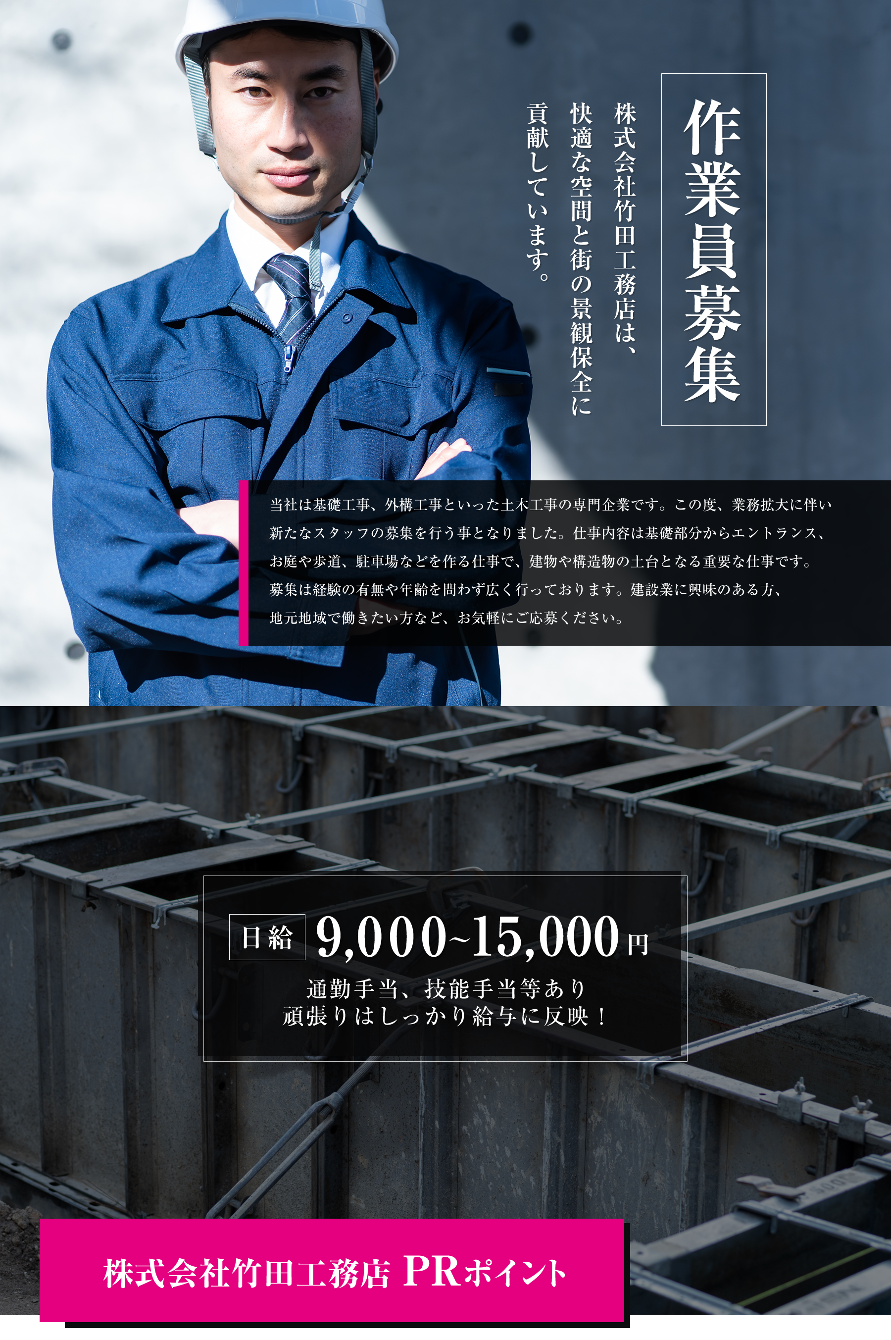 | 主な仕事内容 | 建物の基礎工事や外構工事、駐車場の舗装工事などを行います。 |
